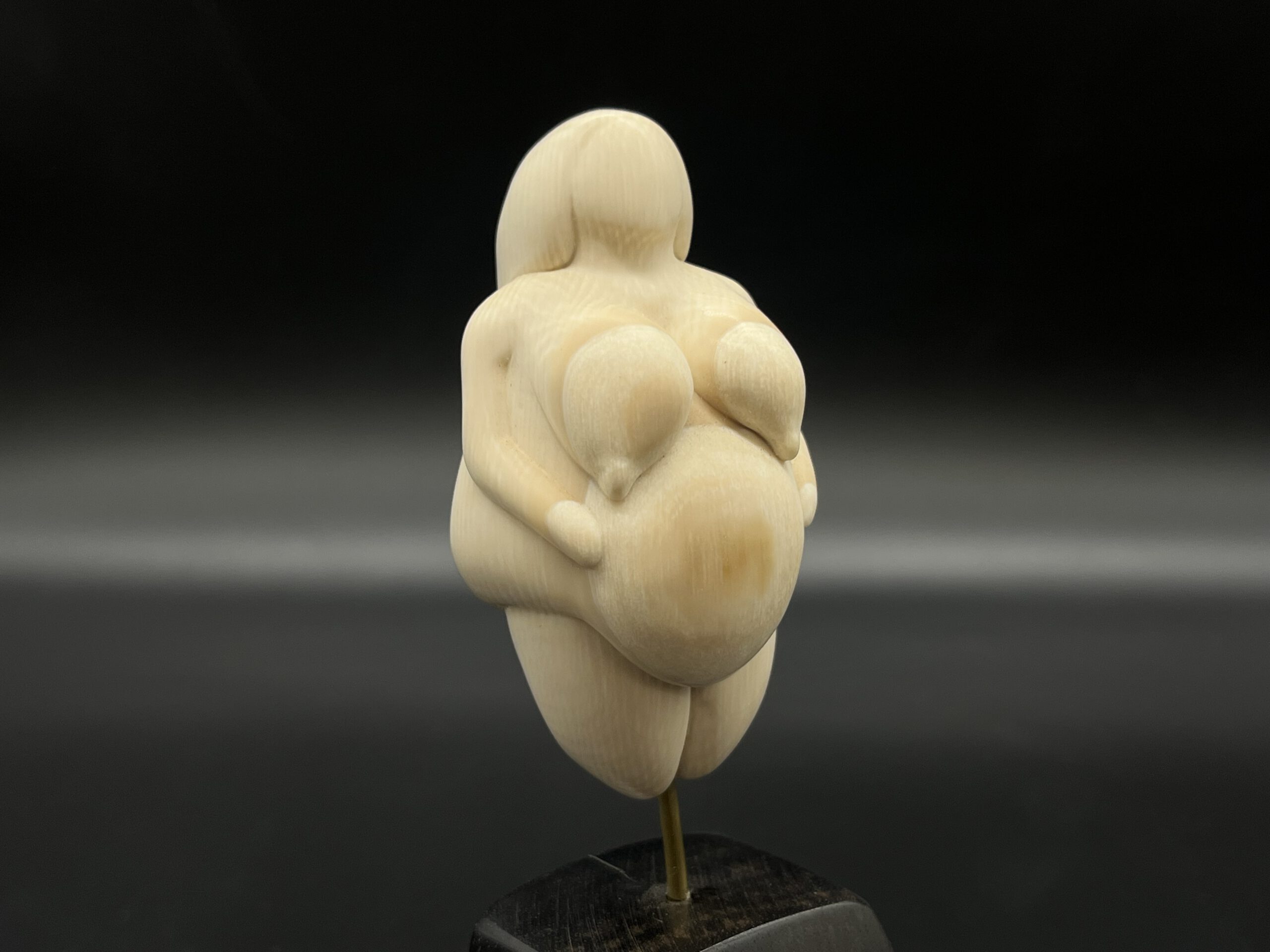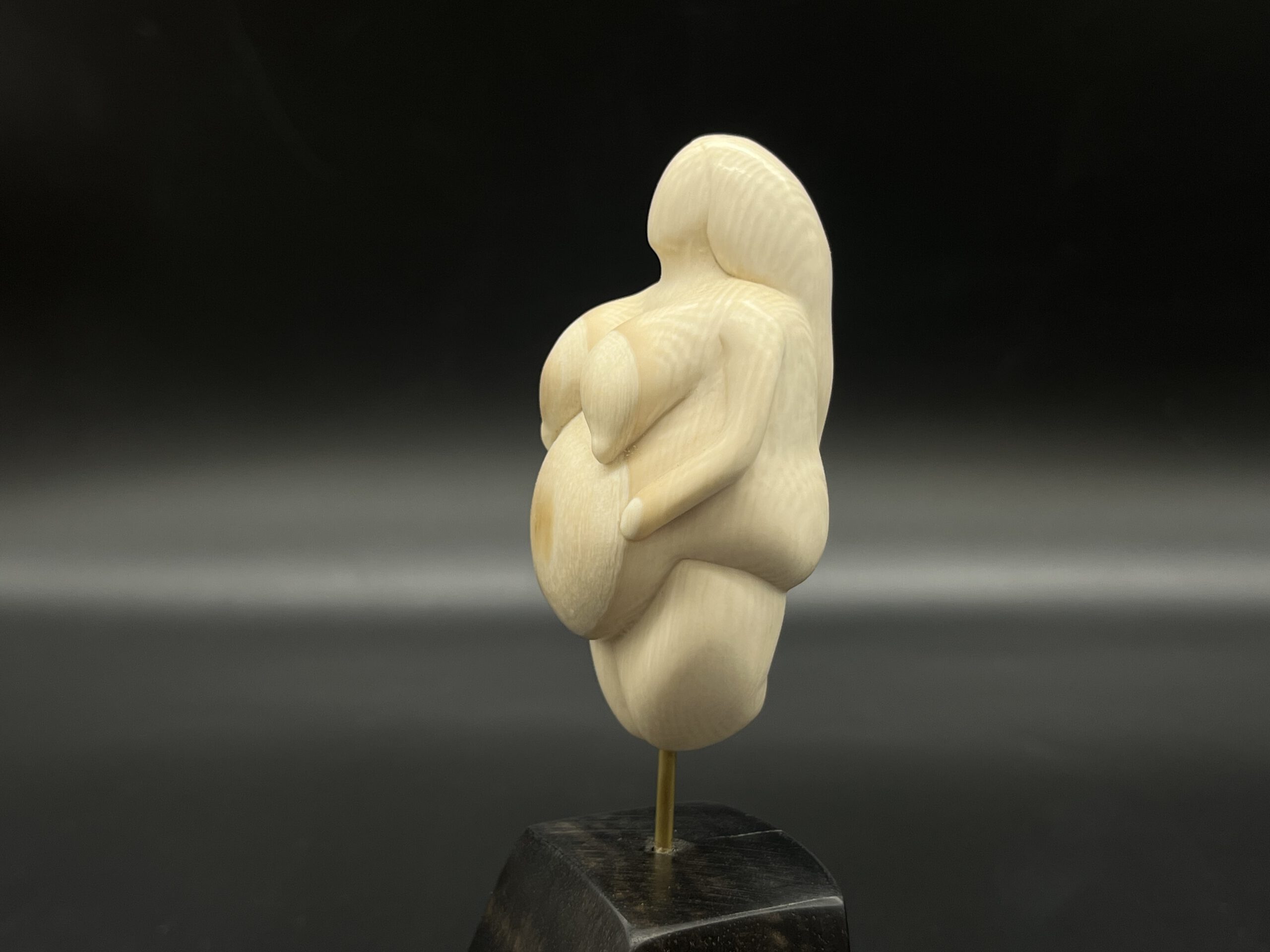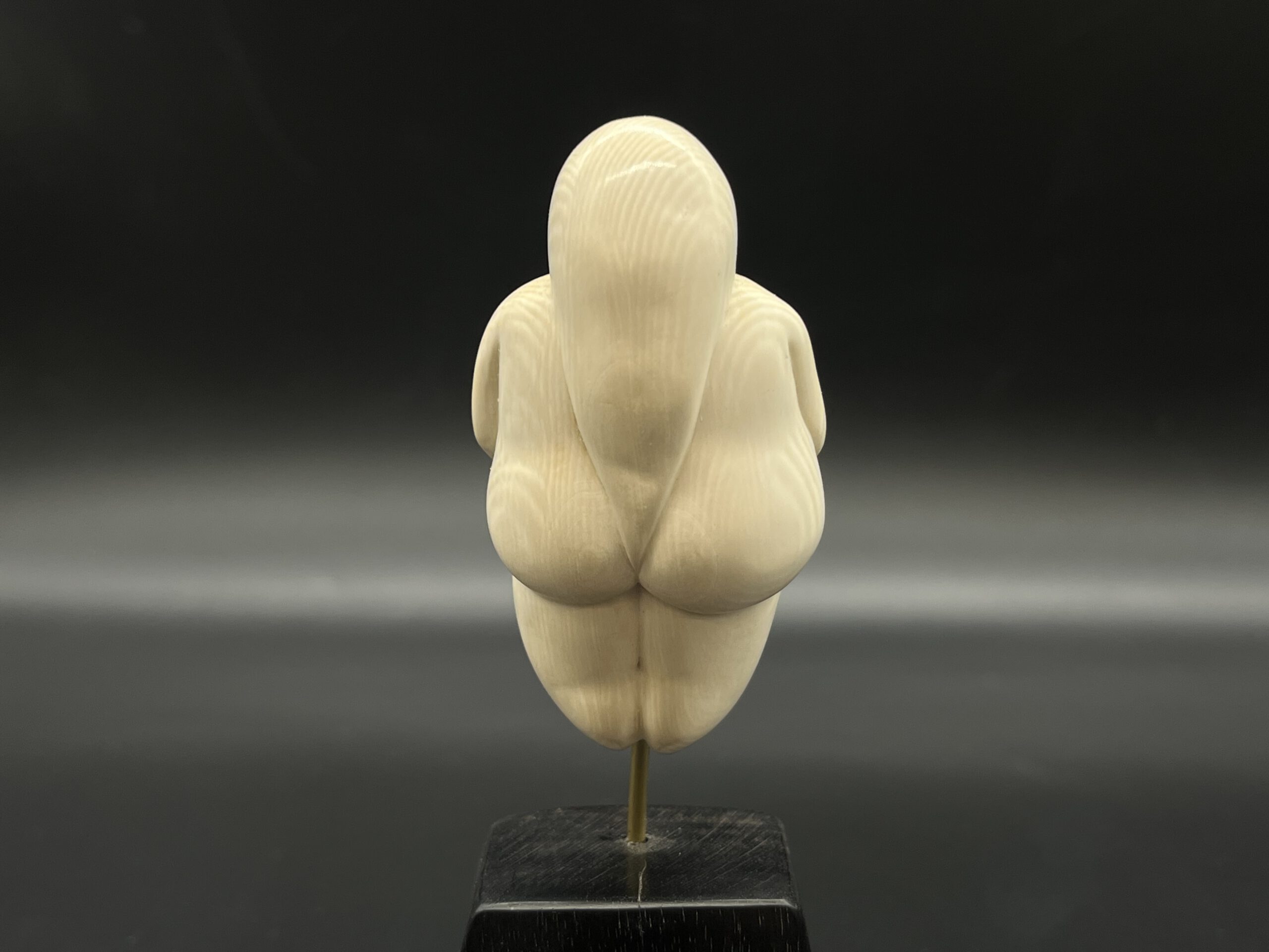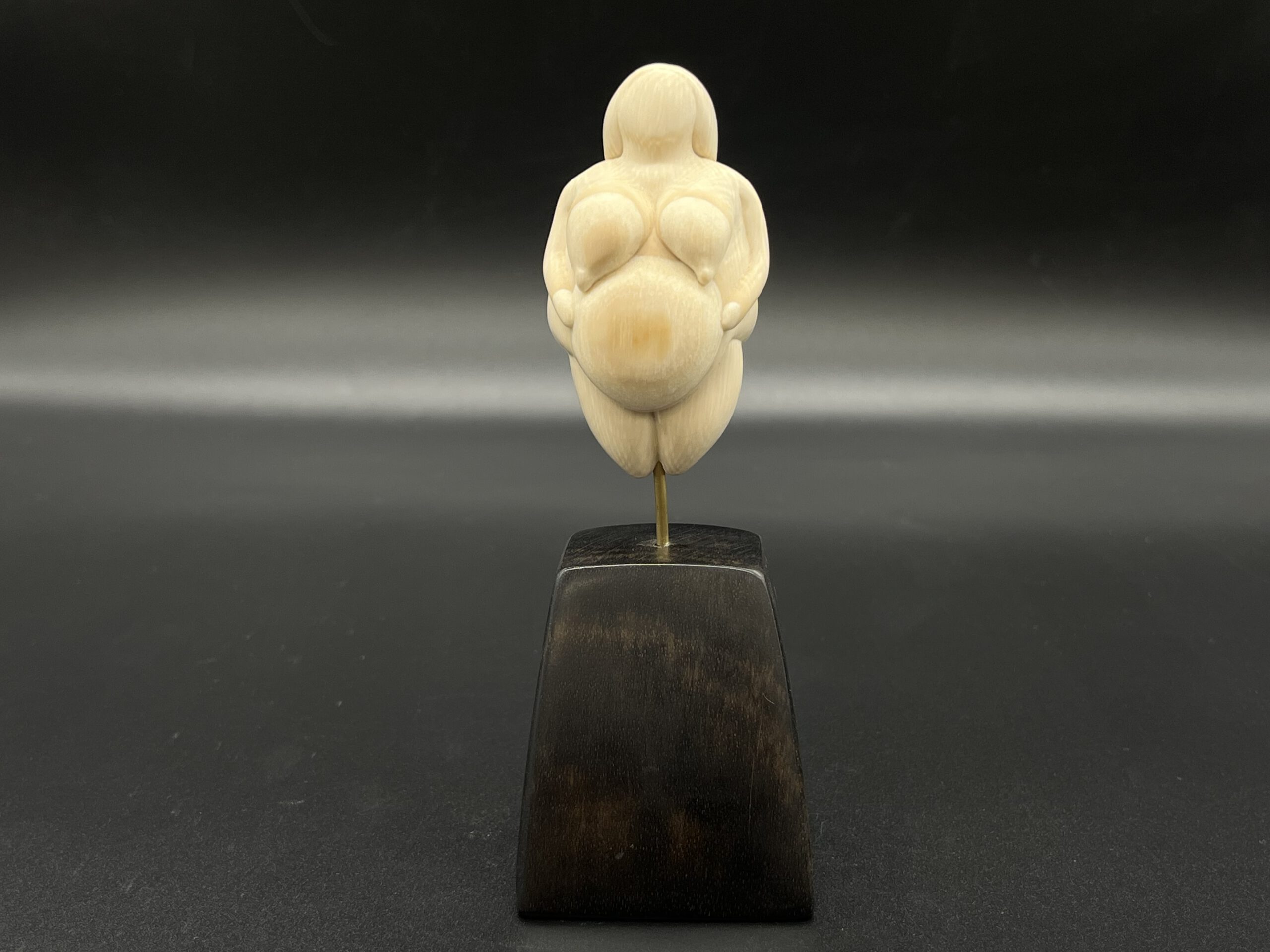 Frauenfigur aus Mammutelfenbein auf Holzsockel.