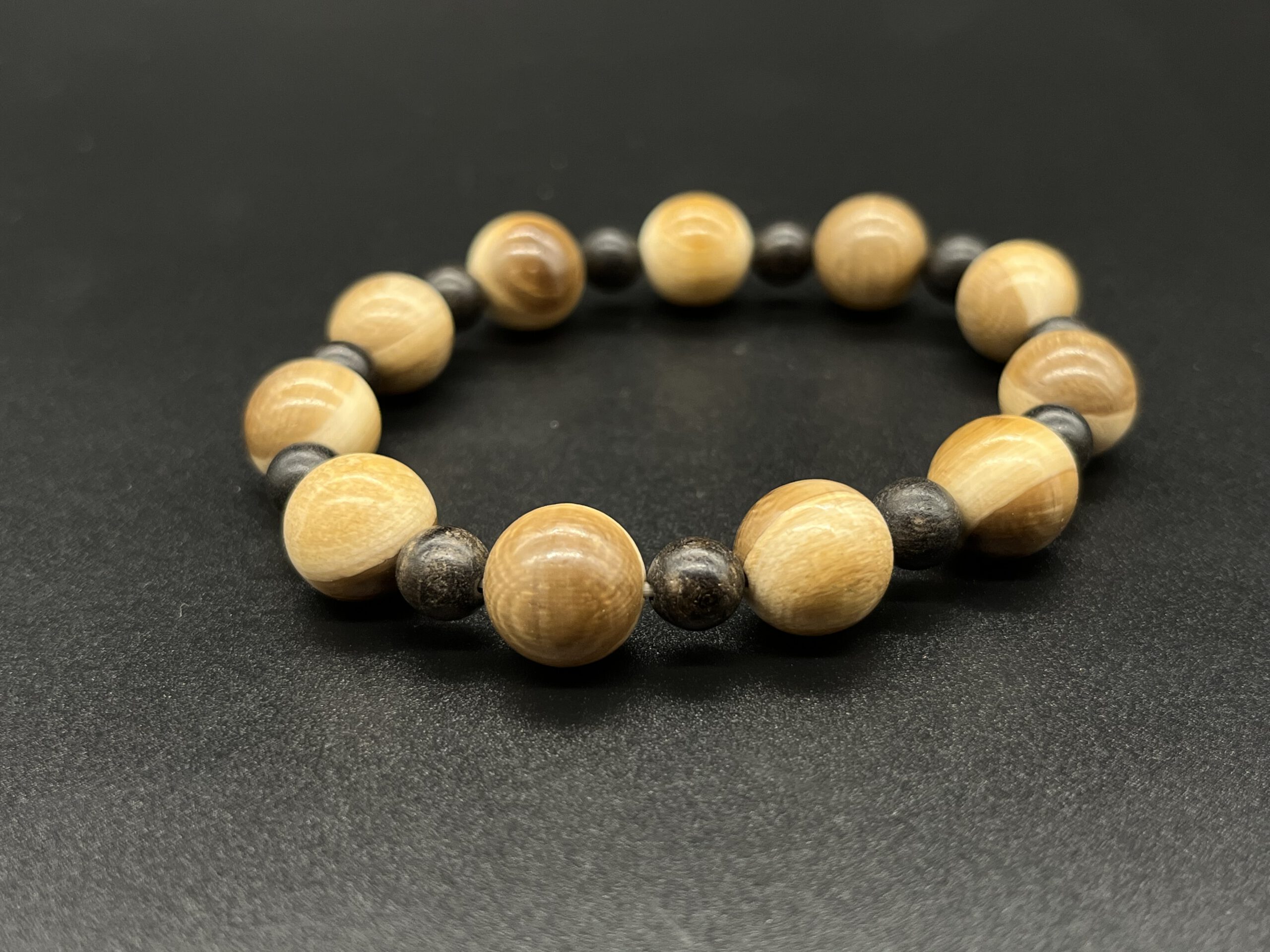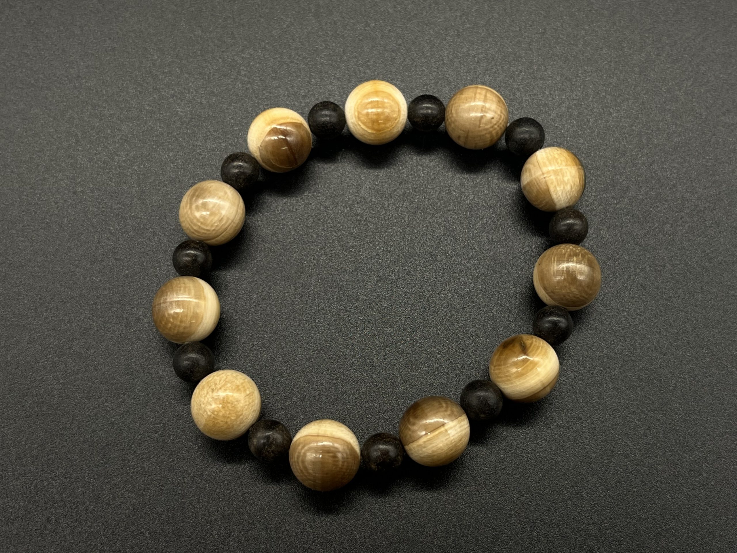 Elastisches Armband aus gedrechselten Kugeln – Mammutelfenbein & Holz.