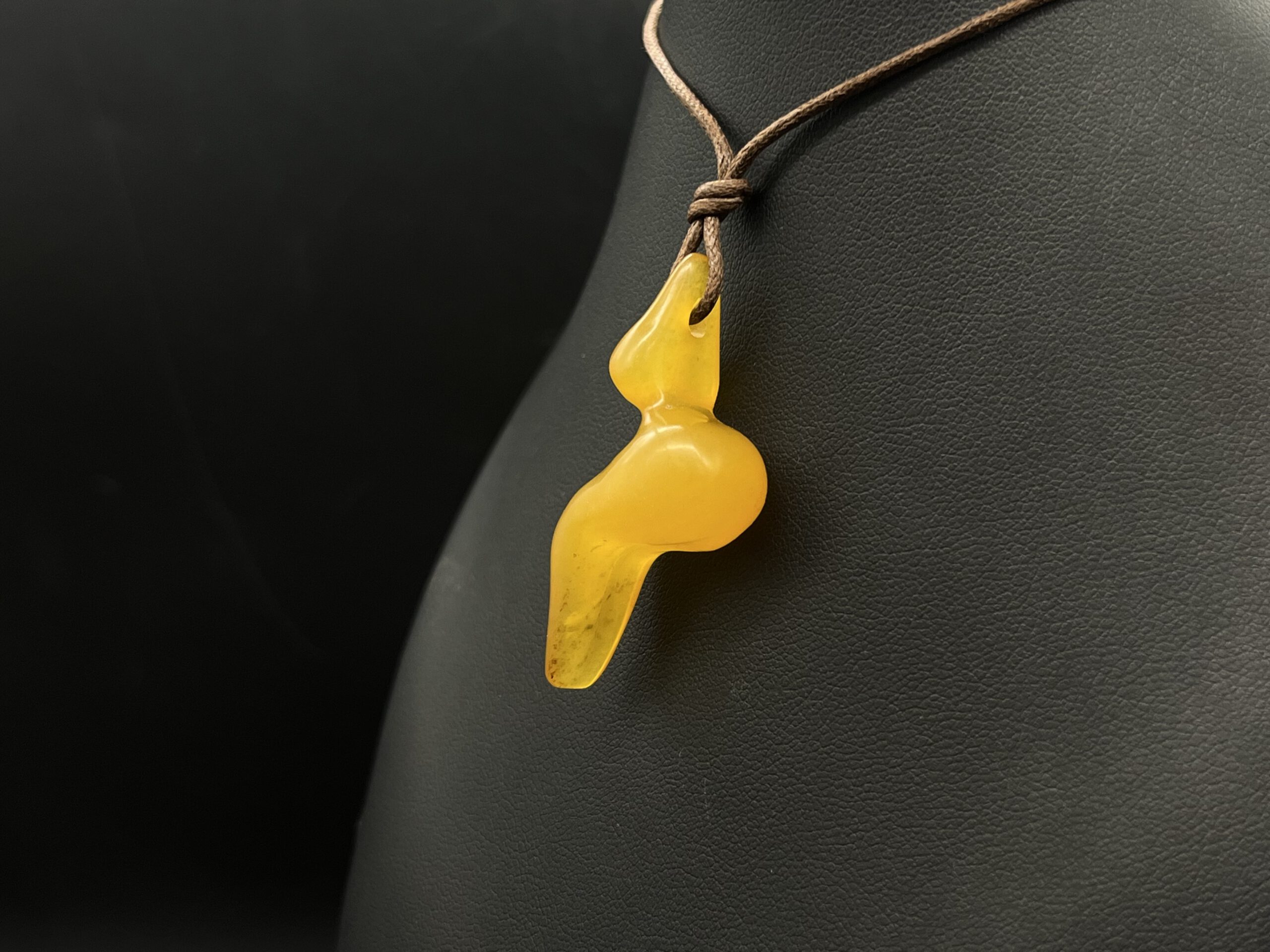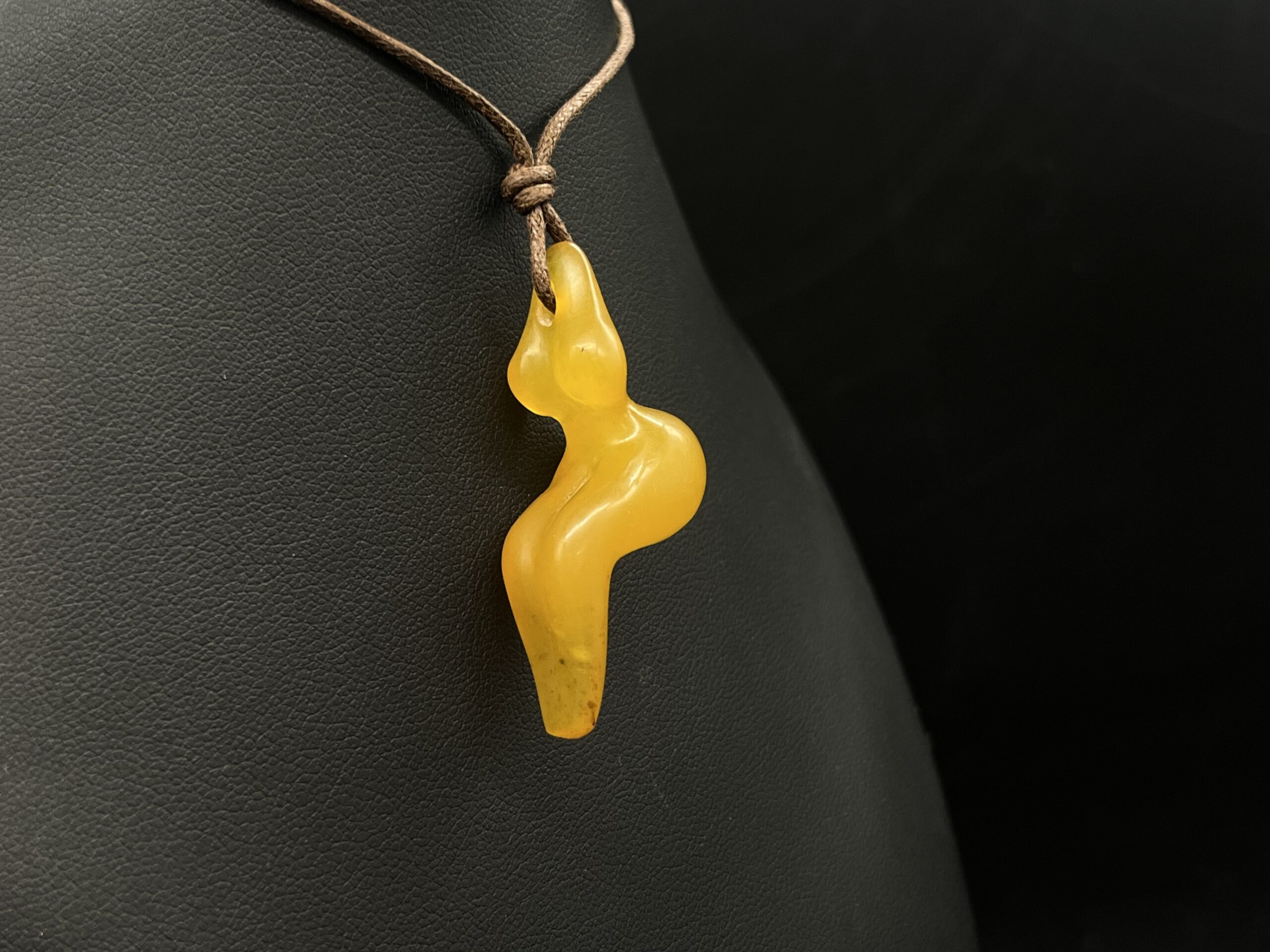 Frauenfigur ähnlich Petersfels Darstellungen aus Bernstein an Textilband.