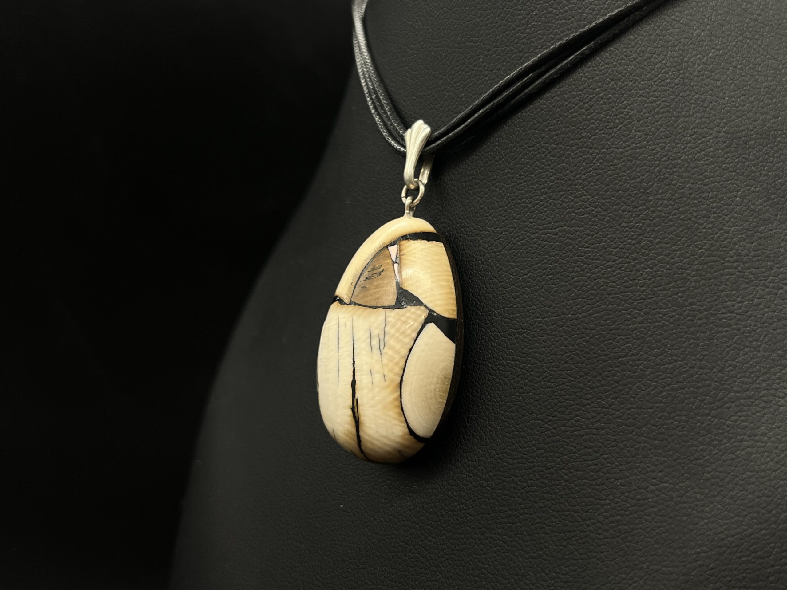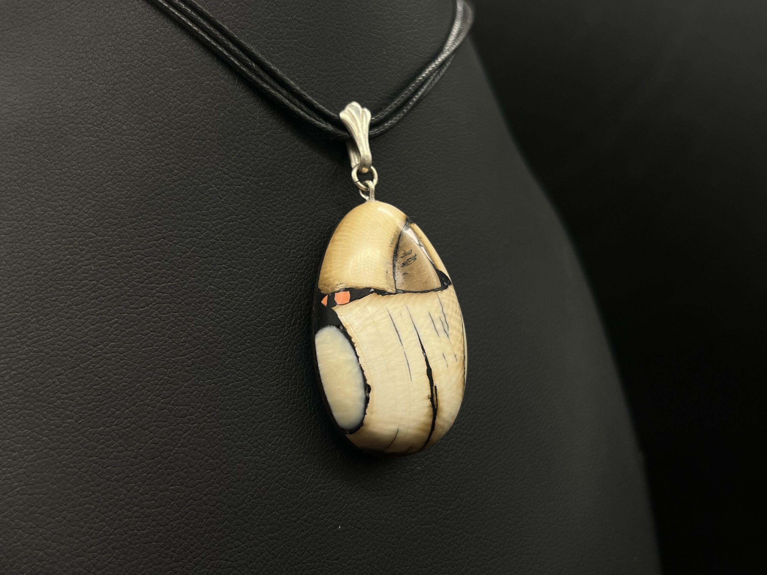 Ei-Relief aus Mammutelfenbein mit Intarsien aus Koralle an Textilband.