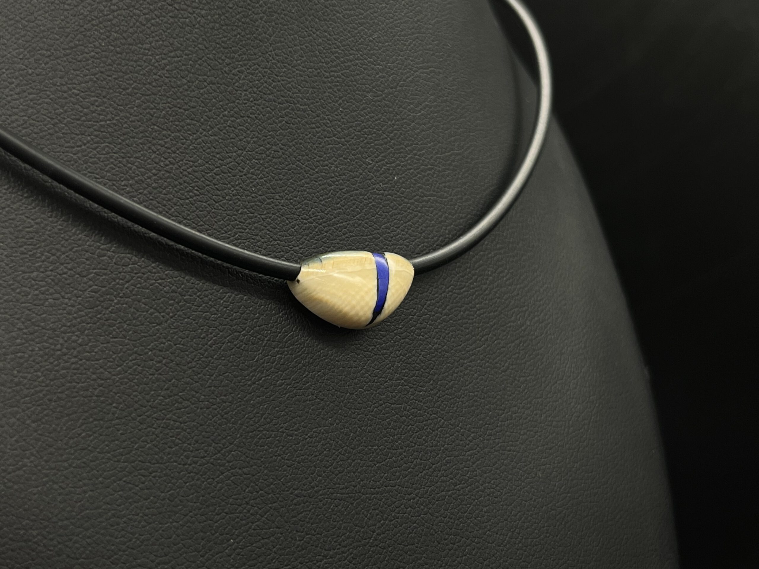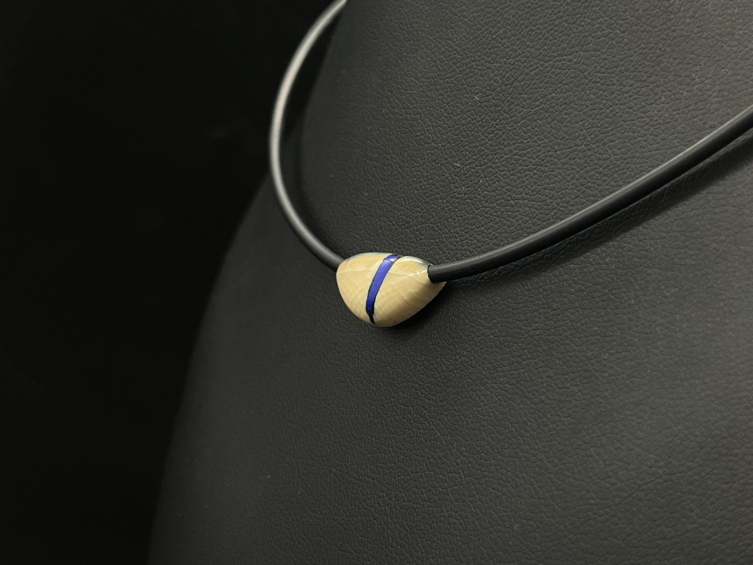 Mammutelfenbeinschmuck mit Intarsien aus Lapislazuli an Kautschuckband.