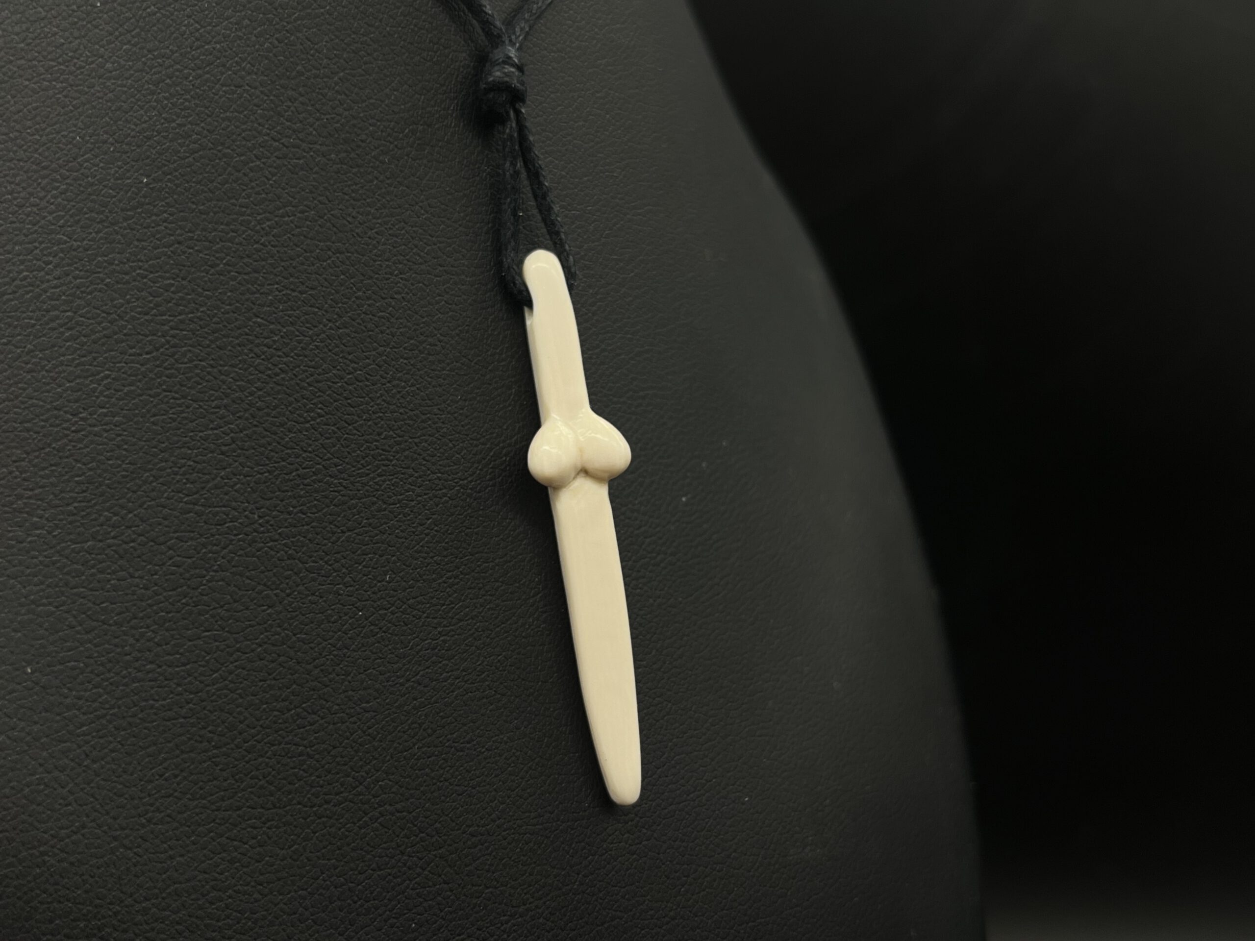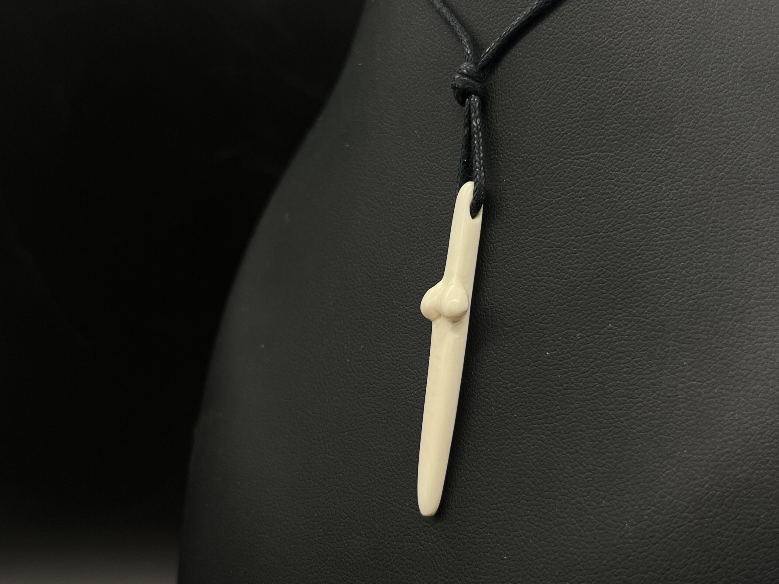 Stilisierte frauenfigur – nachbildung aus mammutelfenbein an textilband.