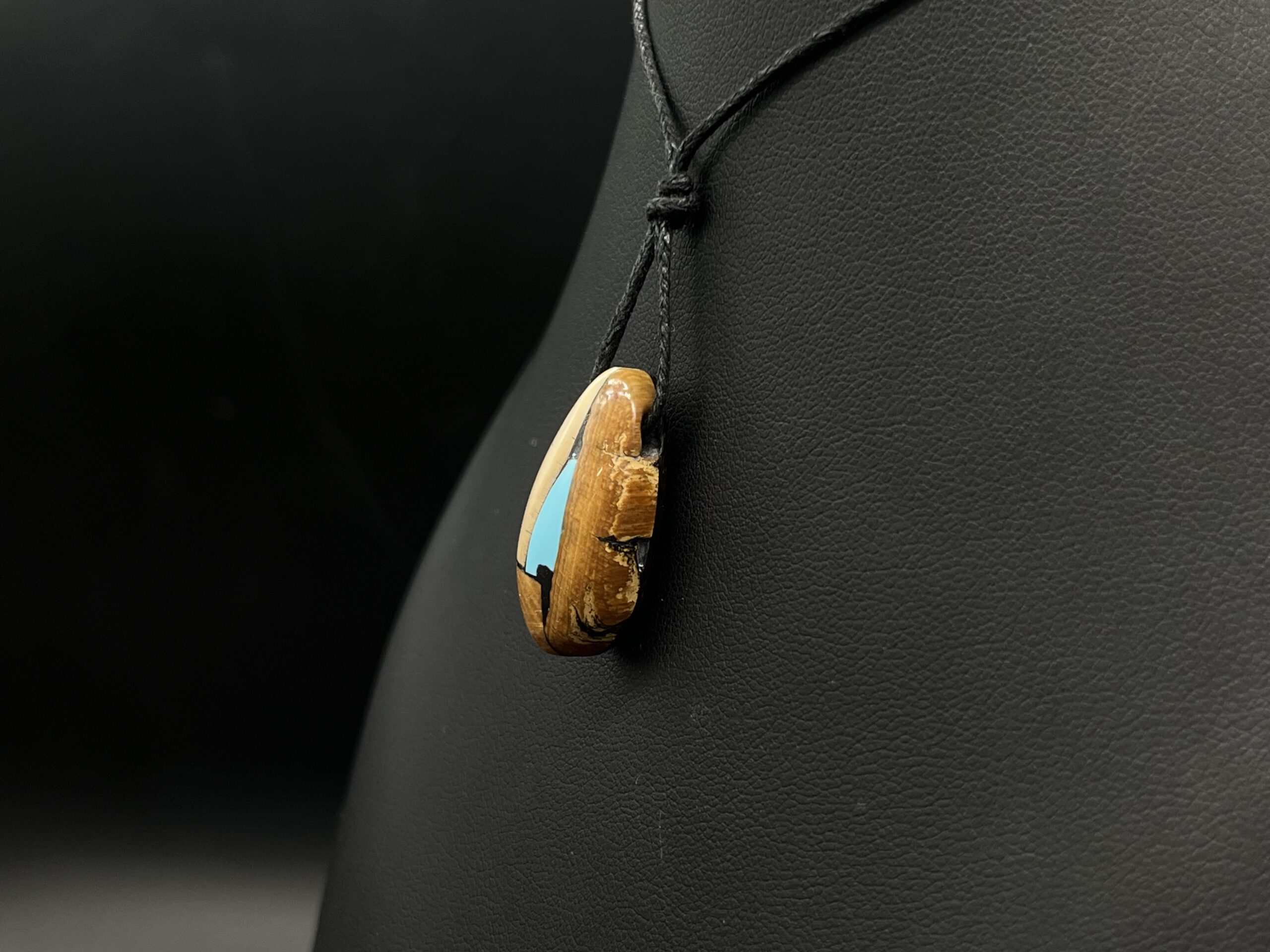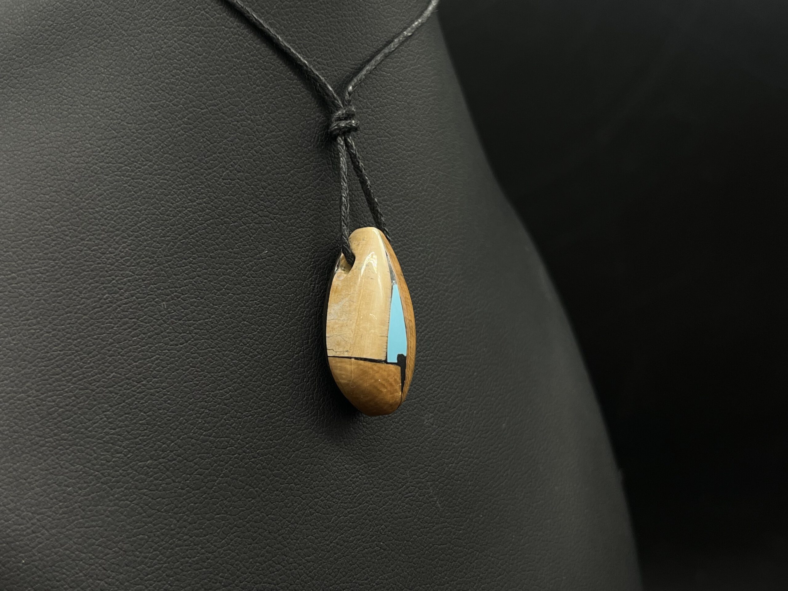 Anhänger aus Mammutelfenbein mit Intarsien aus Türkis an Textilband.